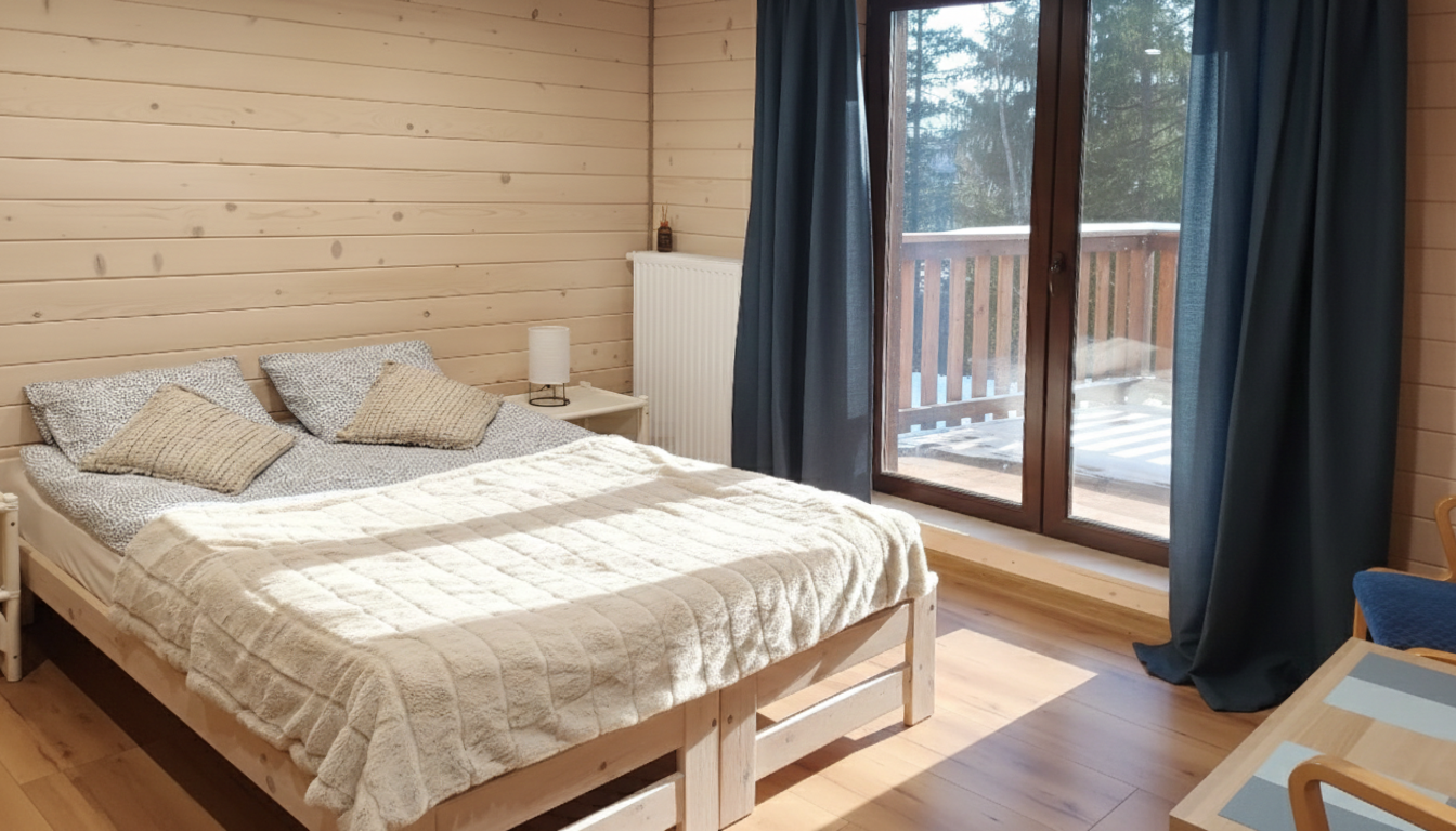 Wschód słońca 4 osobowy, pokój rodzinny przedzielony lekką ścianką, tworzącą dwie kameralne przestrzenie. W większej części znajduje się duże łóżko podwójne (140 x 200) oraz okno tarasowe wychodzące na wschód, przez które o poranku wpada miękkie, naturalne światła.